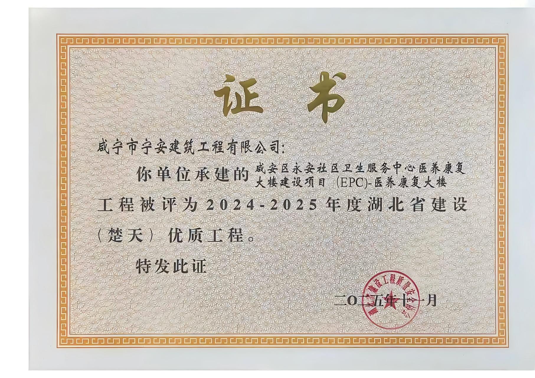 近日,湖北省建筑业协会正式公布2024-2025年度建设工程“楚天杯”获奖名单,由咸宁市宁安建筑工程有限公司承建的“咸安区永安社区卫生服务中心医养康复大楼”赫然在列,成功摘取这项代表全省建筑工程质量最高荣誉的桂冠。尤为引人注目的是该项目早在2024年6月已竣工验收并投入使用,此次获奖是其竣工一年之后,凭借经久耐用的卓越品质和持续稳定的运行表现赢得的“迟来的”肯定!更是显得含金量十足。