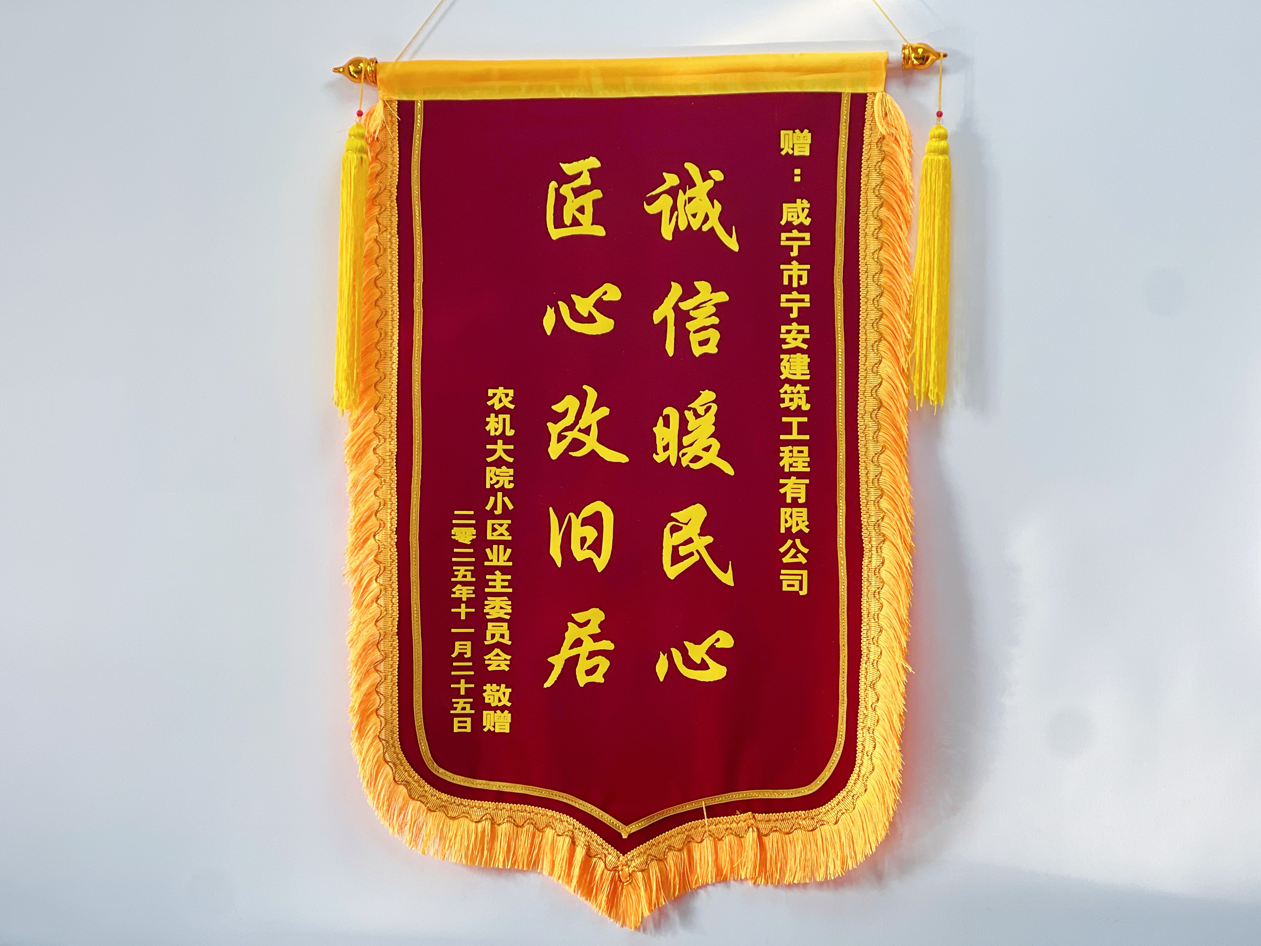 11月25日上午,咸安区温泉街道农机大院小区的多位业主代表们满怀感激之情,将一面印有“匠心改旧居,诚信暖民心”金色大字的锦旗,郑重地交到了宁安公司负责人手中,对小区改造工程带来的巨大变化表达最诚挚的谢意。