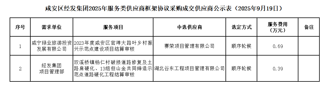 咸安区经发集团2025年服务类供应商框架协议采购成交供应商公示表(2025年9月19日)