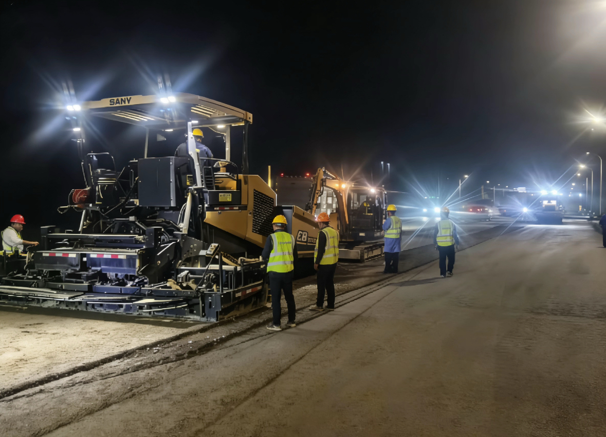 为抢抓公路建设黄金施工期,结合咸安近期晴雨不定、日间交通流量较大的实际情况,项目采用“夜间抢进度、白天补短板”的半幅施工方案:夜间利用车流量小的窗口期,集中开展水稳摊铺、路面碾压等核心作业;白天则进行施工区域清理、设备检修、质量检测等工作,确保施工效率与安全并行。截至目前,项目整体进度已完成70%,其中水稳层完成约23万平方米、沥青面层完成约16万平方米,核心路面施工环节高效推进。
